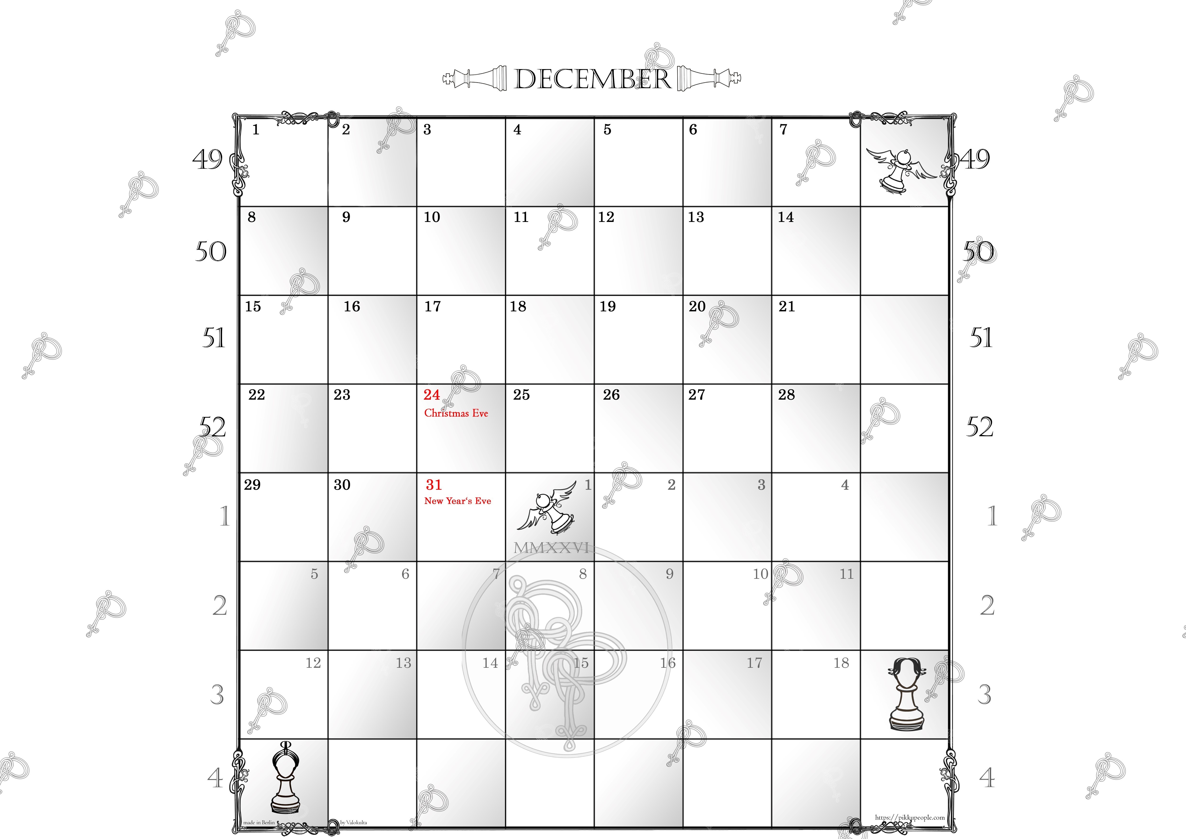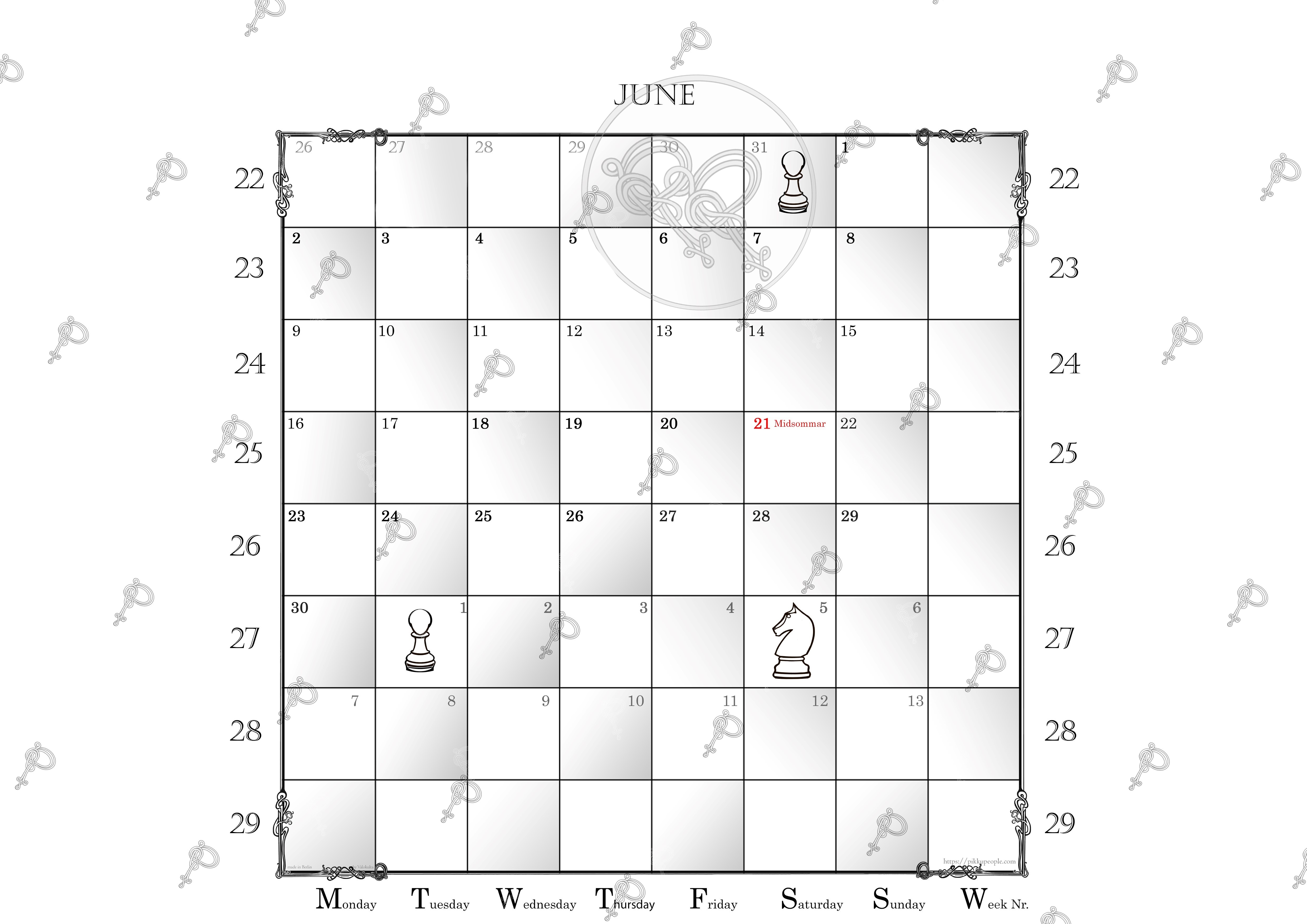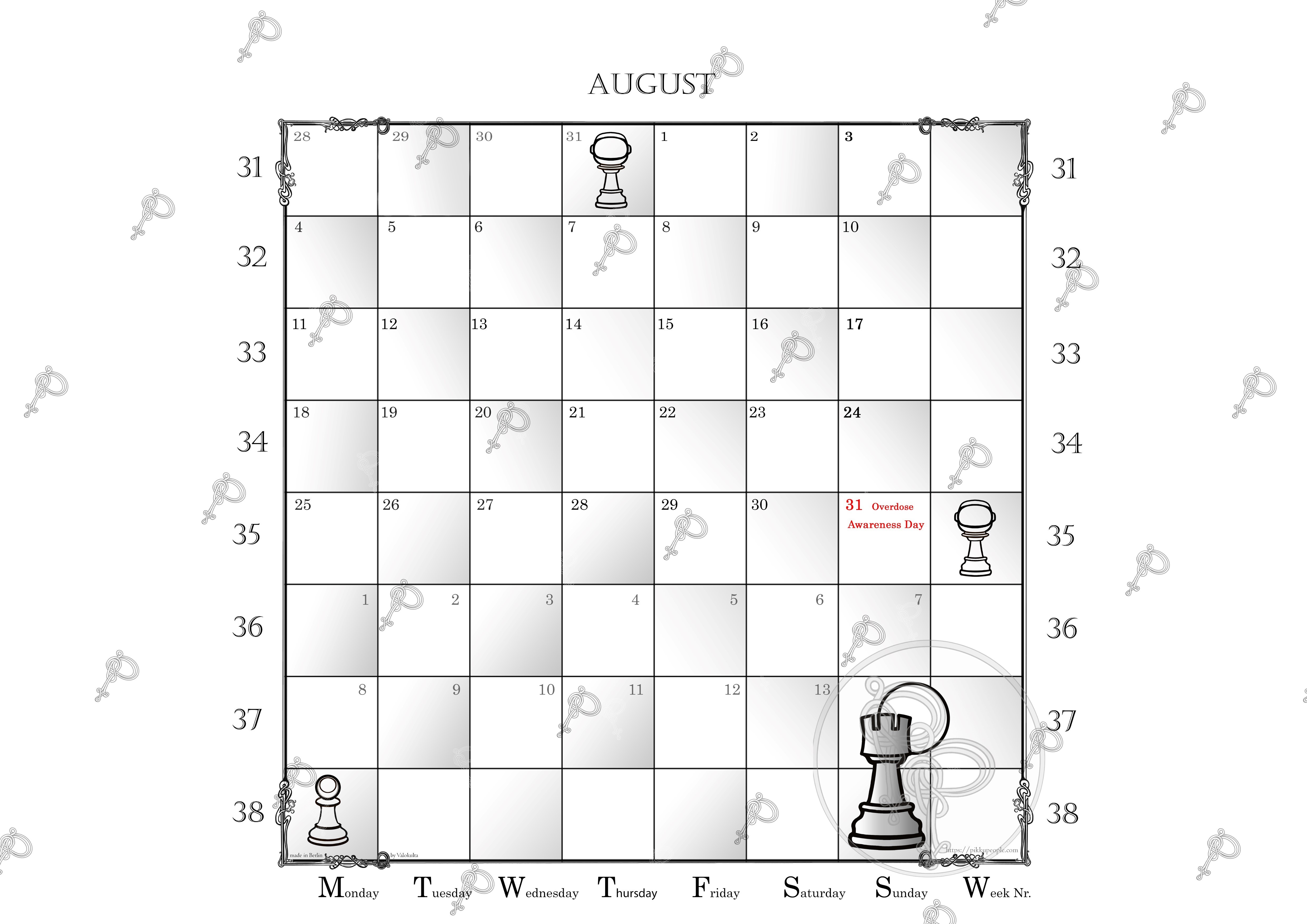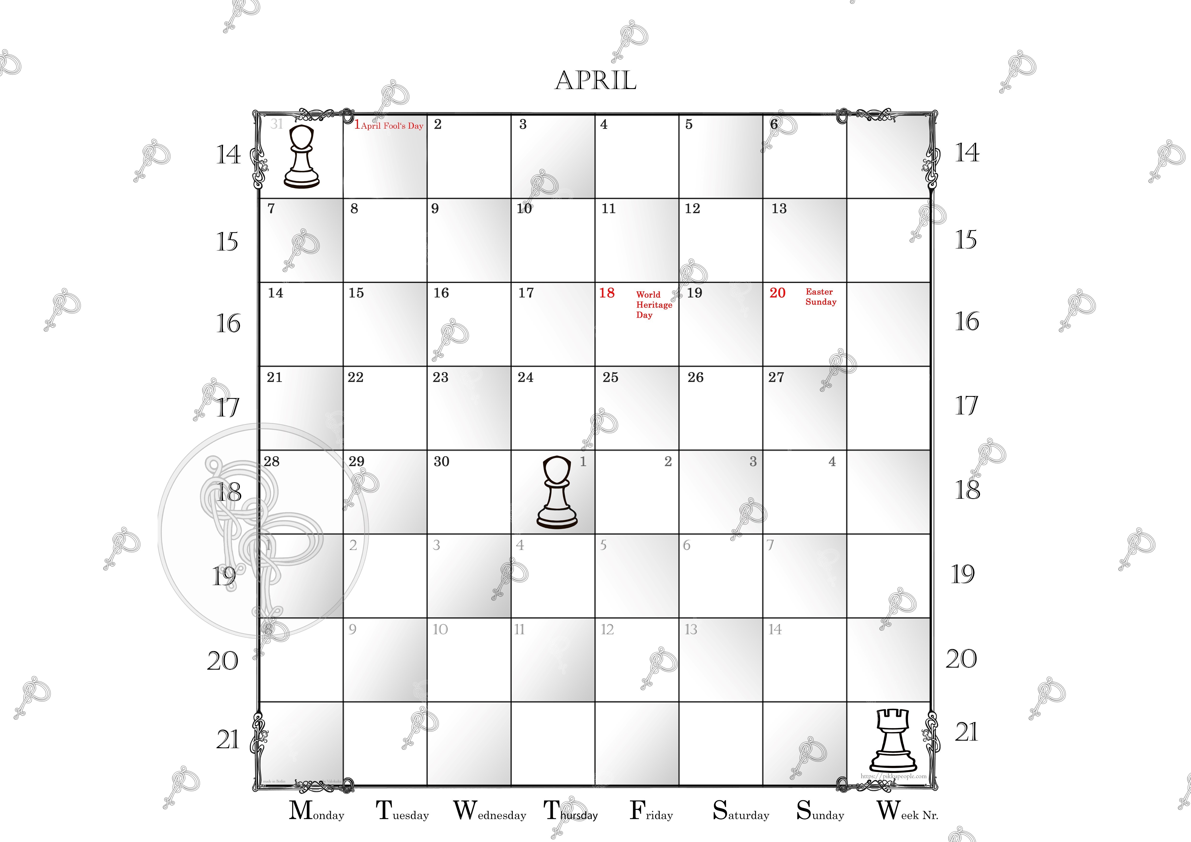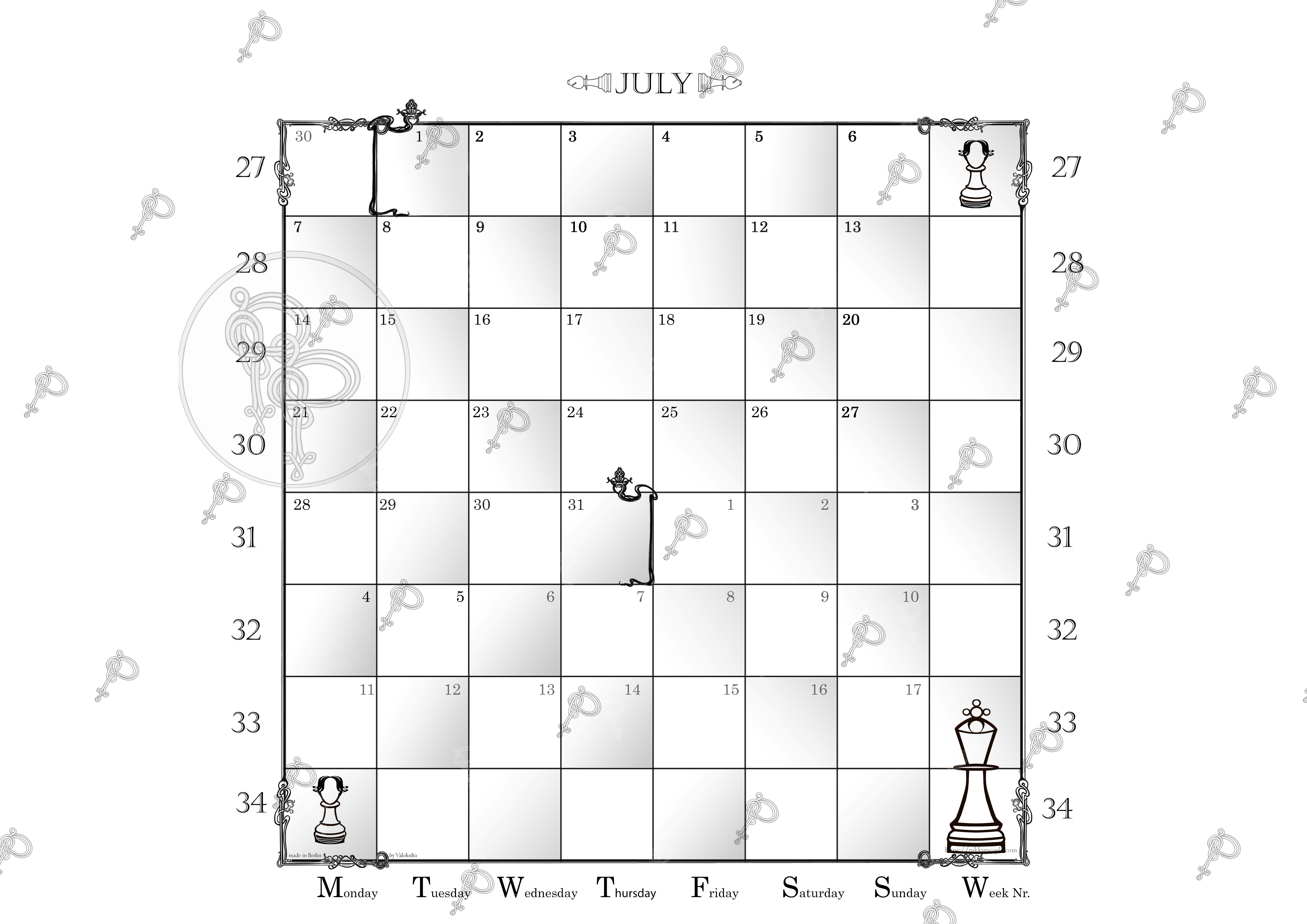 Since 7-day-weeks are put on the 8×8 square chessboard you have an extended view of each month to come, so it’s more like one-and-a-half month per calendar page. Please let me know if I should add some important date in the next edition like p.e. a chess legend’s anniversary.